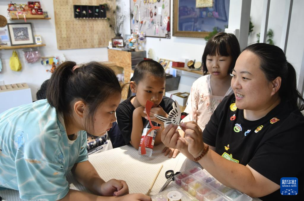 在怀柔区桥梓镇禧宝露文化中心,孩子们了解北京市级非物质文化遗产代表性项目沙燕吉祥鸟的制作技艺(8月6日摄)。