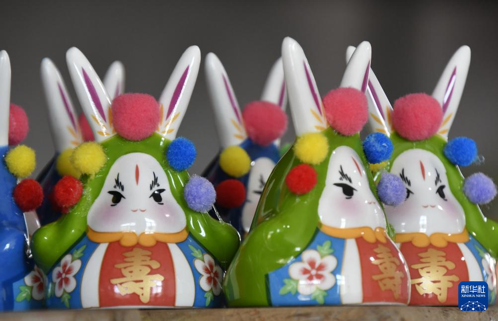 这是8月6日在怀柔区桥梓镇禧宝露文化中心拍摄的北京传统吉祥物兔爷文创产品。