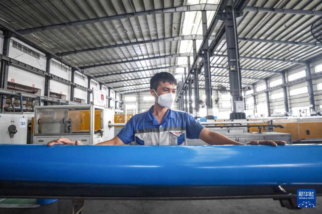 9月4日,海南联塑科技实业有限公司的工作人员在查看生产线运转情况。