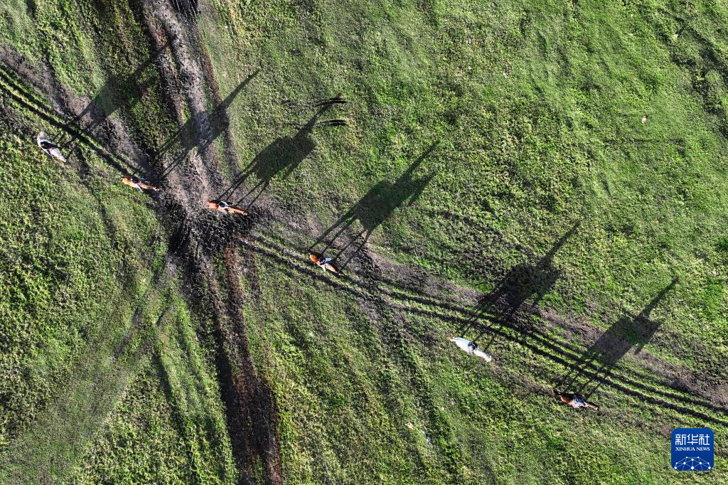 9月17日,在内蒙古呼伦贝尔市额尔古纳市恩和俄罗斯族民族乡恩和村,游客体验骑马(无人机照片)。
