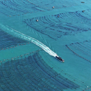 11月10日,在山东省荣成市桑沟湾海洋牧场,养殖工人在养殖区穿梭作业(无人机照片)。