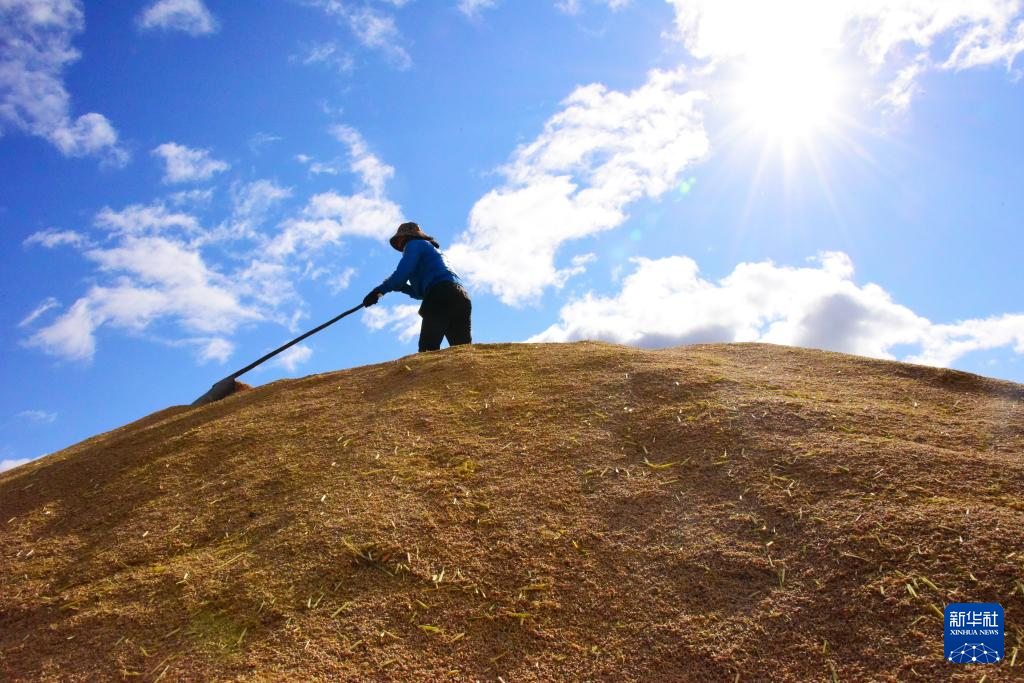 10月8日,在北大荒集团黑龙江绥滨农场有限公司东井管理区粮食晒场,工人对收获的水稻进行集中堆放。