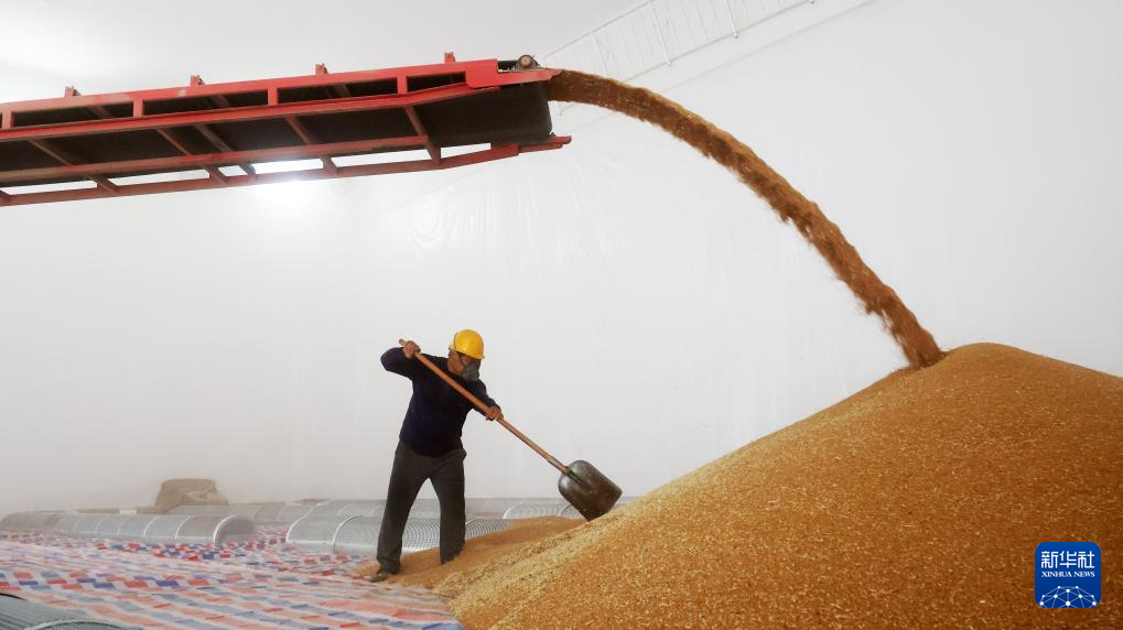 这是11月12日拍摄的黑龙江汤原鹤立国家粮食储备库有限责任公司内粮食收储的场景(无人机照片)。
