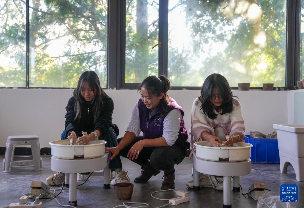 12月20日,研学讲师(左二)在曼海村研学中心教游客制作陶器。