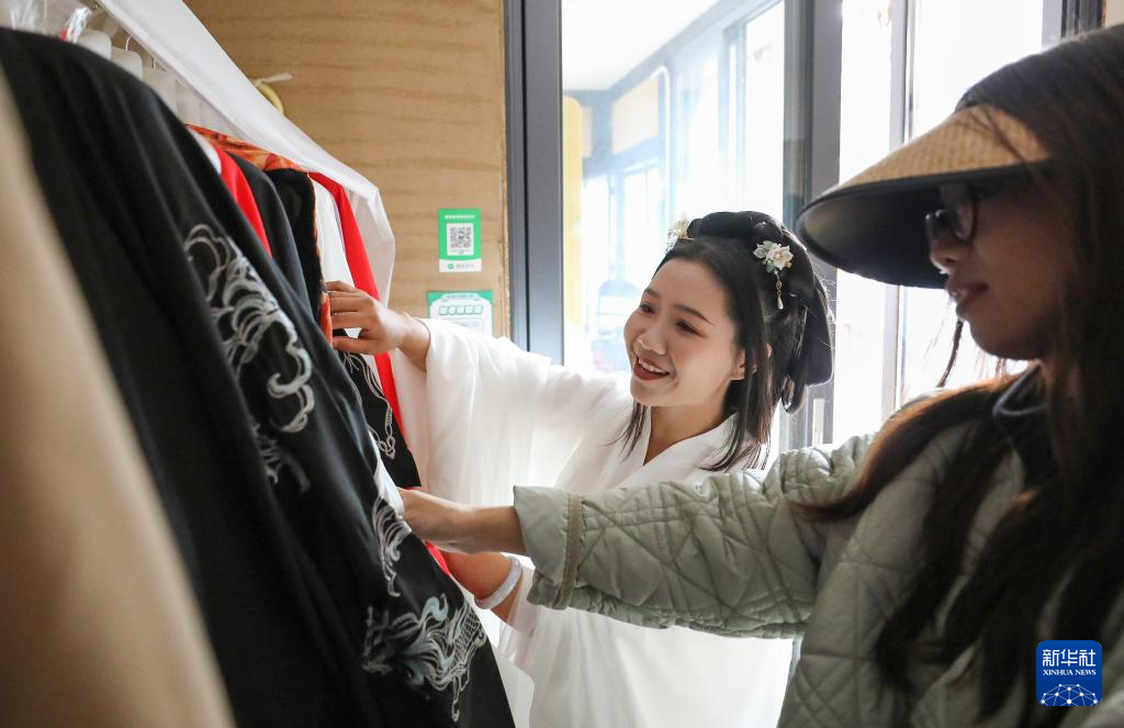 12月25日,游客在猛龙渡一家古风摄影工作室挑选服饰。