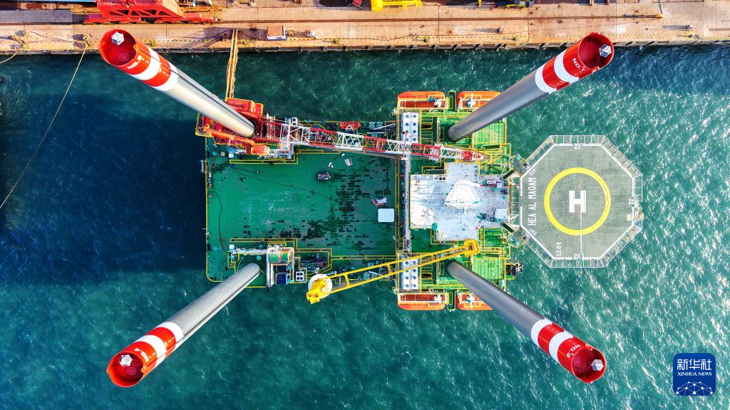 12月24日,在青岛海西湾船舶与海洋工程产业基地,海上作业平台在建设中(无人机照片)。