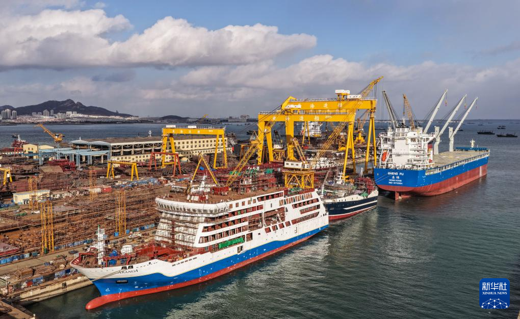 12月25日,在山东省荣成市一家造船企业,船舶建造与维修作业有序进行(无人机照片)。