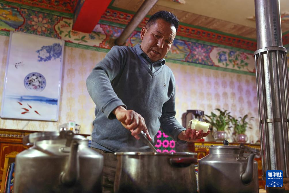 2月16日,在拉萨堆龙德庆区东嘎街道桑木社区,群群在搅拌“古突”。