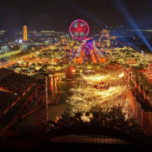 2月20日,民间艺人在河北省唐山市丰南区河头老街为游客表演“打树花”(无人机照片)。
