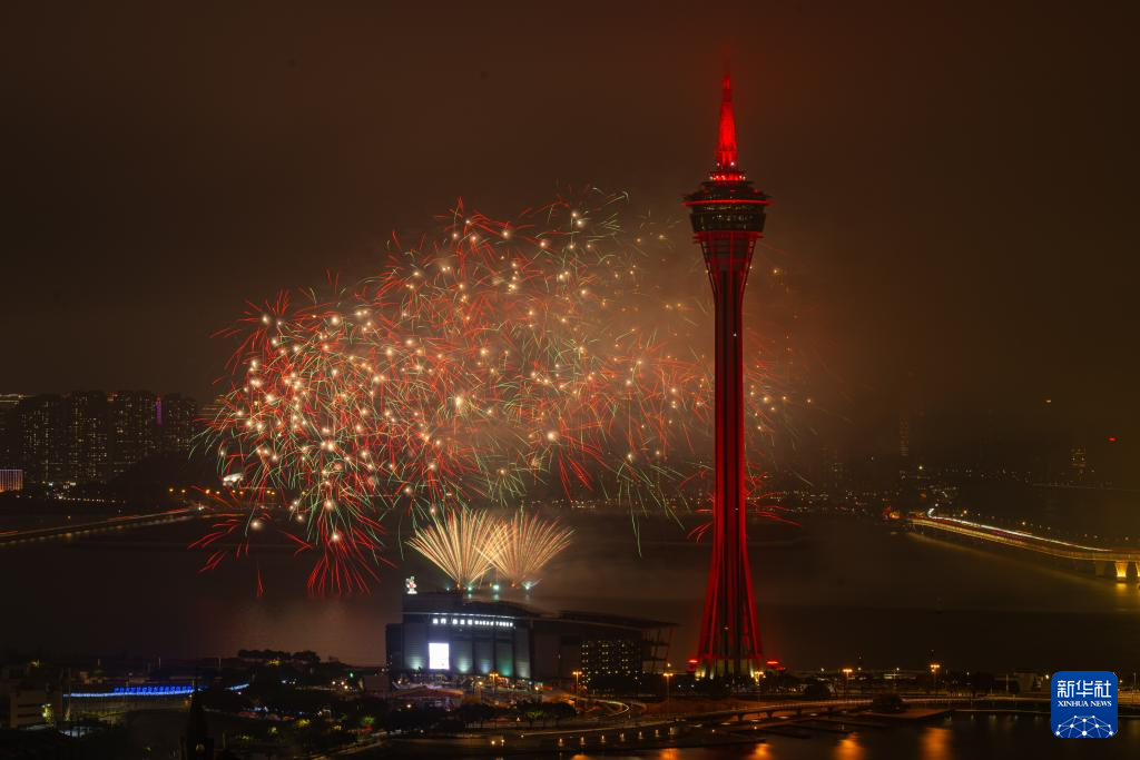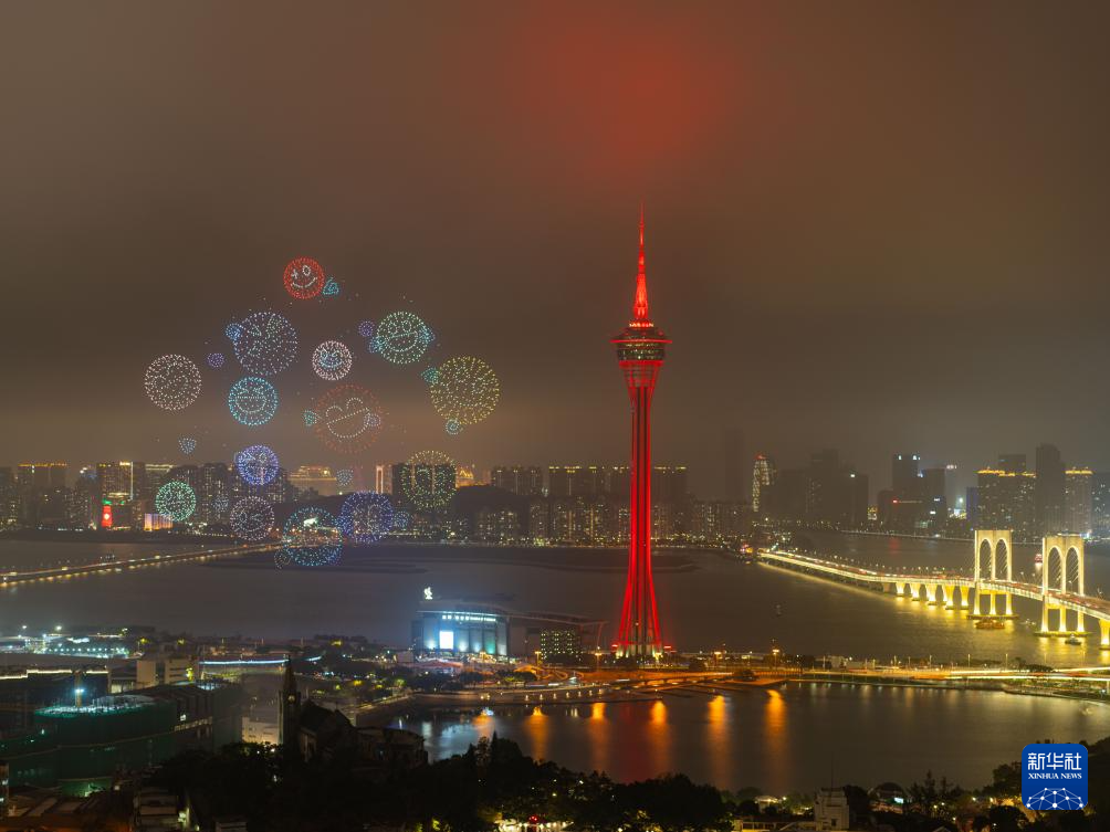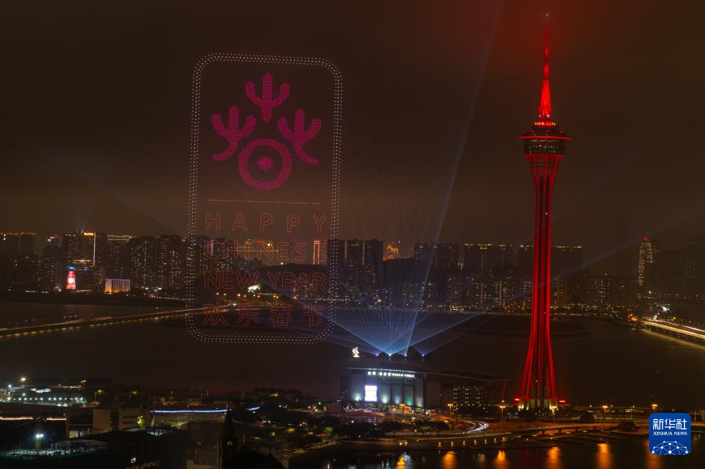 2月23日,澳门旅游局在澳门旅游塔对出海面举行“金骏云翔 欢乐春节”2026无人机烟花汇演第二场。