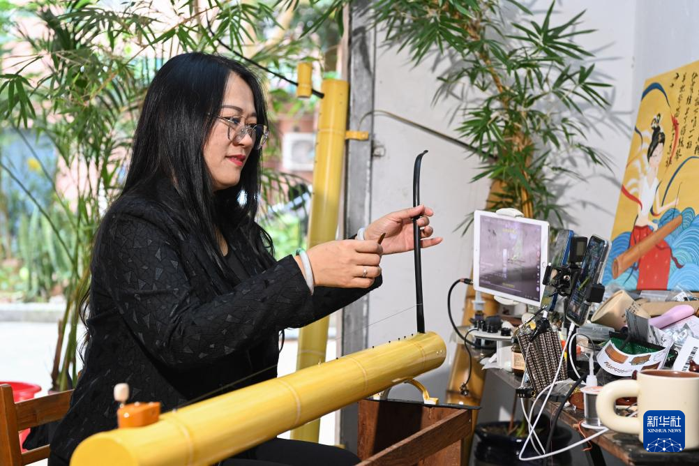 2月7日,苏海珍在位于广西东兴市的工作室内通过手机直播向网民演奏独弦琴。