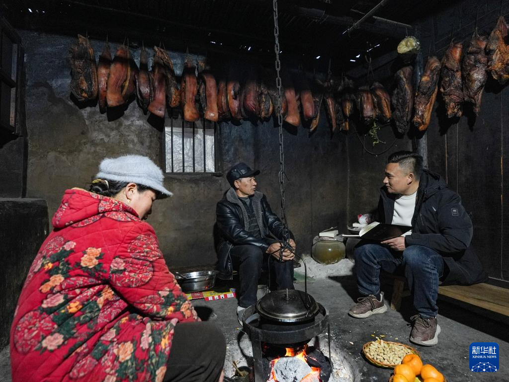 1月28日,郑望春(左)在古路村村民向开强家中调研、交流。