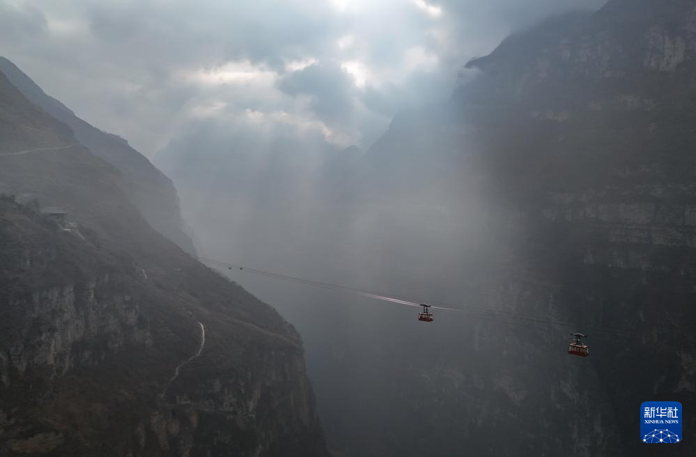 这是1月29日拍摄的地处大渡河大峡谷的四川省汉源县永利彝族乡古路村索道(无人机照片)。