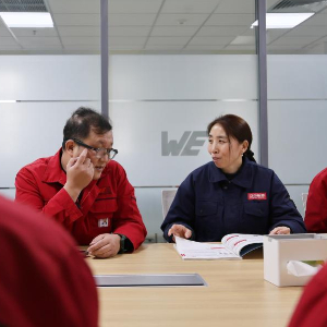 2月25日,在天津立中车轮有限公司,郭红静(中)利用午餐时间听取职工建议。