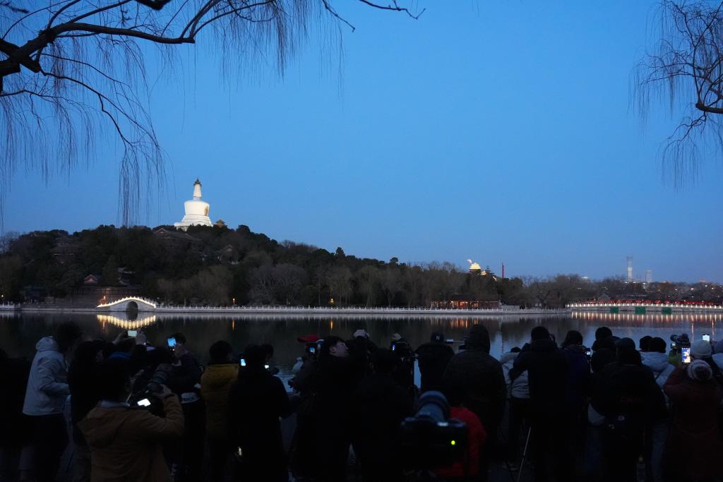 3月3日,游客在北京北海公园观看、拍摄月全食。