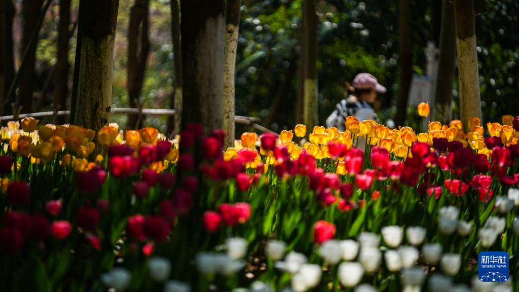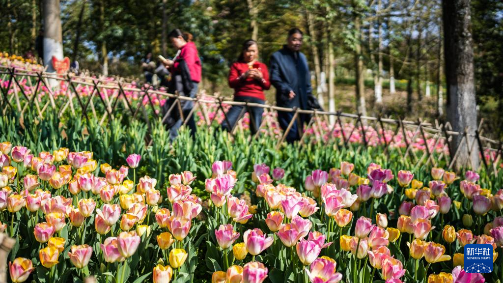 近日,贵州省黔南布依族苗族自治州龙里县龙架山国家森林公园内的数万株郁金香竞相绽放,吸引各地游客前来游玩赏景。
