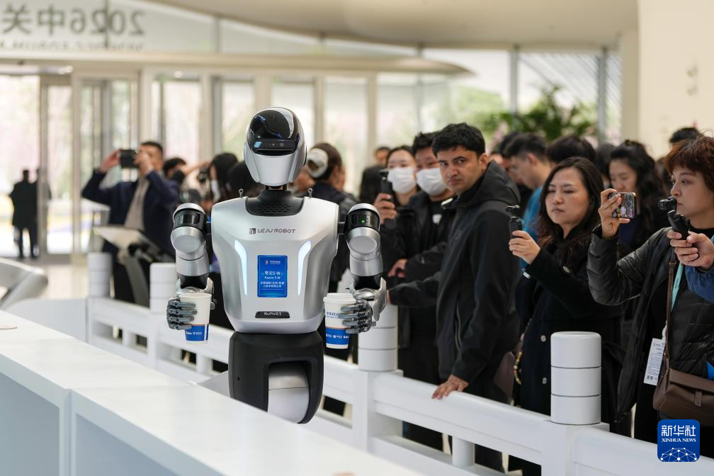 3月24日,在中关村论坛年会新闻中心内,一台机器人向观众招手。
