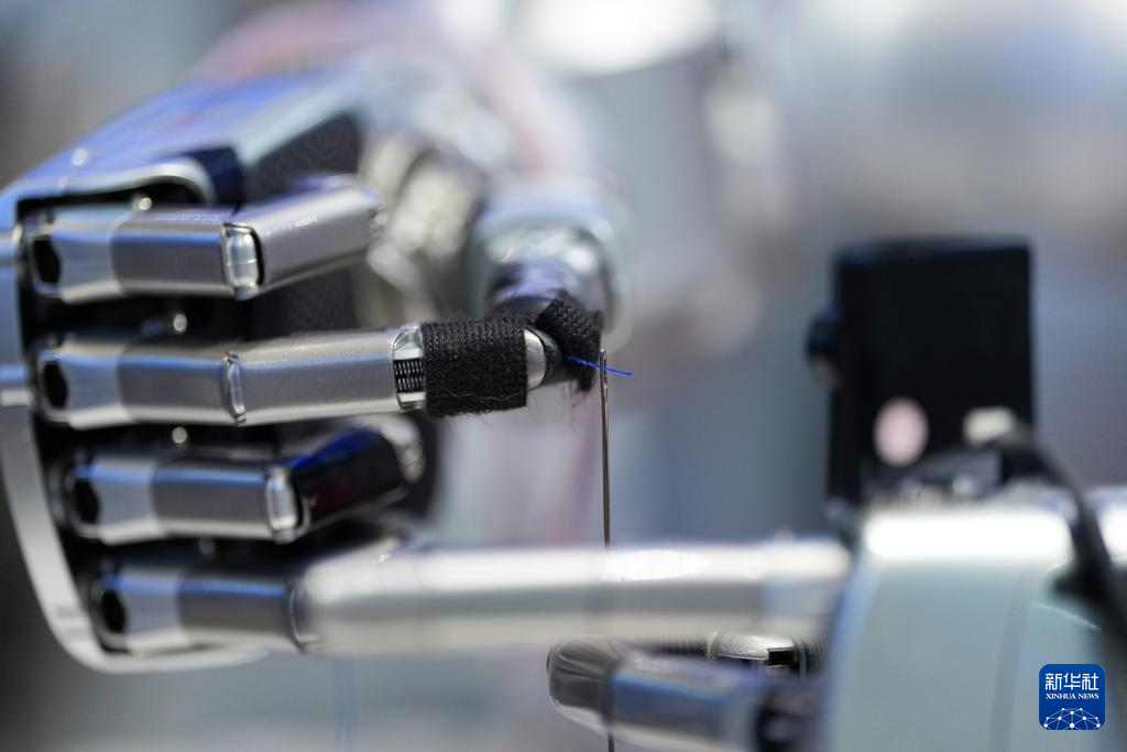 3月24日,在中关村展示中心常设展上,一台配备了灵巧手的机器人展示穿针引线。