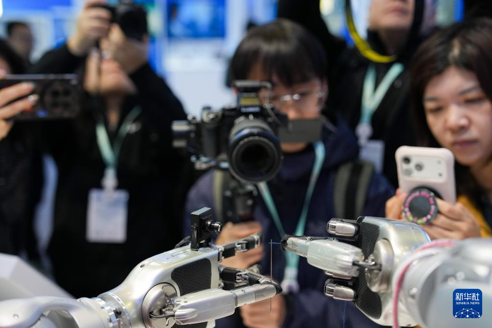 3月24日,在中关村展示中心常设展上,一台配备了灵巧手的机器人在展示穿针引线。