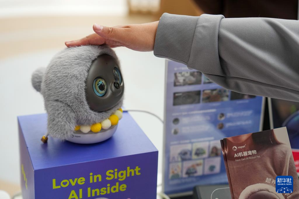 3月24日,在中关村国际创新中心,参观者触摸一款AI机器宠物。
