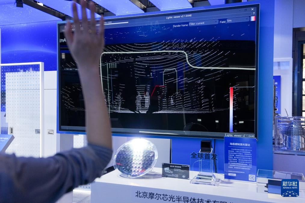 在中关村展示中心常设展上,一位工作人员在演示一款可用于自动驾驶与机器人的动态感知激光雷达(3月25日摄)。
