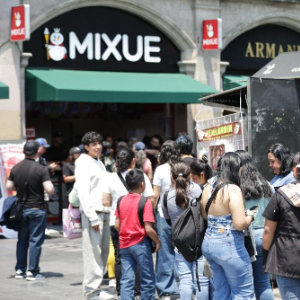4月1日,在墨西哥首都墨西哥城的宪法广场,消费者排队等待购买蜜雪冰城的产品。