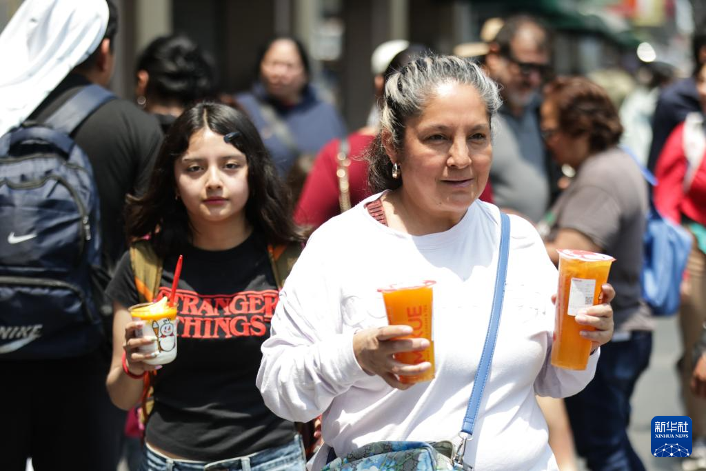 4月1日,在墨西哥首都墨西哥城的宪法广场,消费者饮用蜜雪冰城的饮品。