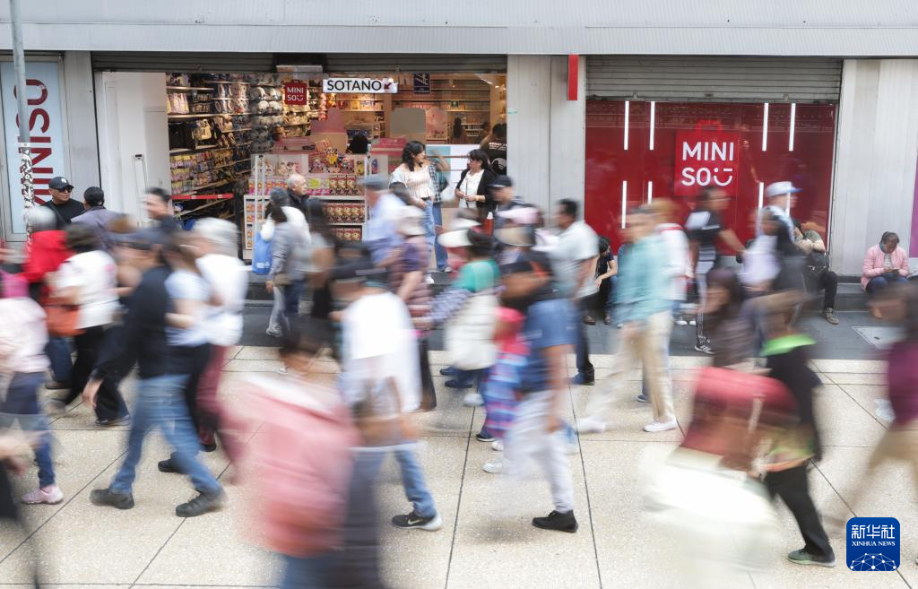 4月1日,在墨西哥首都墨西哥城的老城区,行人经过一家名创优品门店。