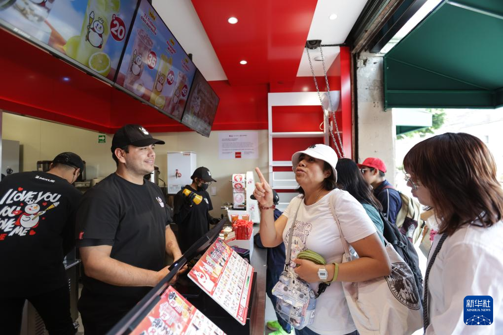 4月1日,在墨西哥首都墨西哥城的宪法广场,消费者选购蜜雪冰城的产品。