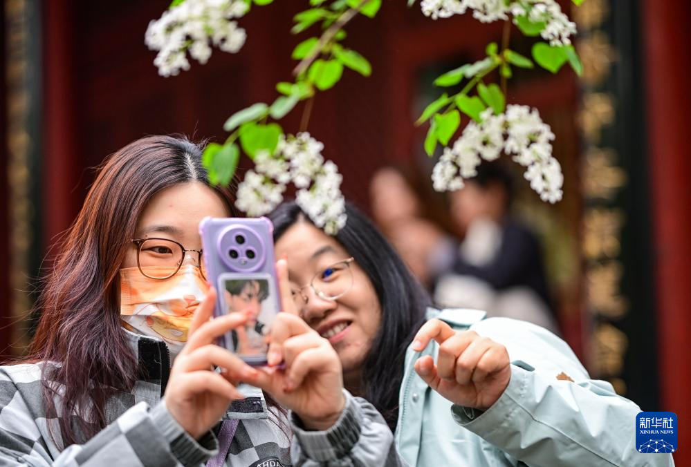4月3日,游客在法源寺内自拍留影。