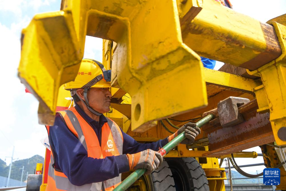 4月3日,工人操作铺轨机在渝万高铁铺轨工程建设现场施工作业。