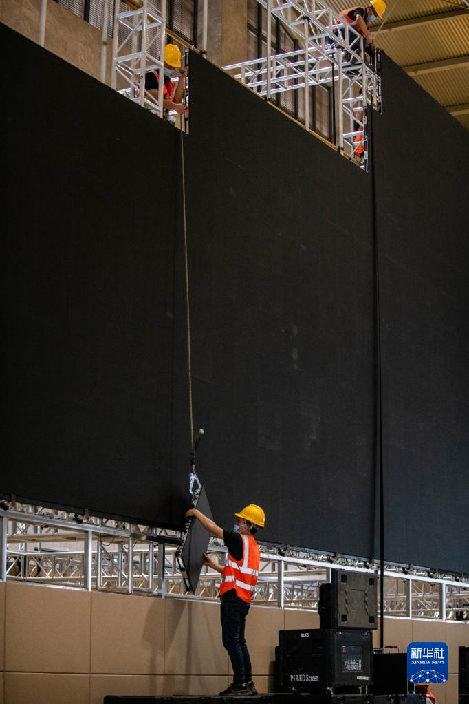 在昆明滇池國際會展中心,工作人員正在搭建會場和新聞中心。施工人員均已接種兩劑新冠肺炎疫苗,每天進場還要測體溫、戴口罩。會場相關設備將使用可重復利用的材料,會場不進行油漆粉刷、噴涂,也不鋪設地毯。