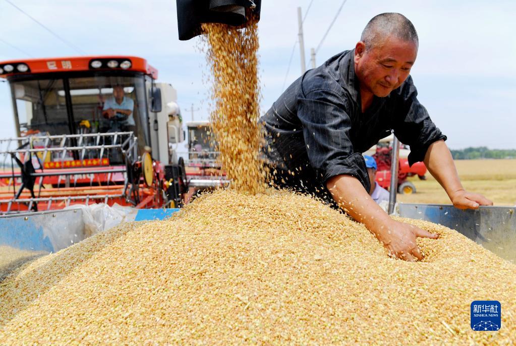 6月13日,河北省衡水市阜城縣崔家廟鎮前磚門村農民在麥田收獲小麥。新華社記者 朱旭東 攝