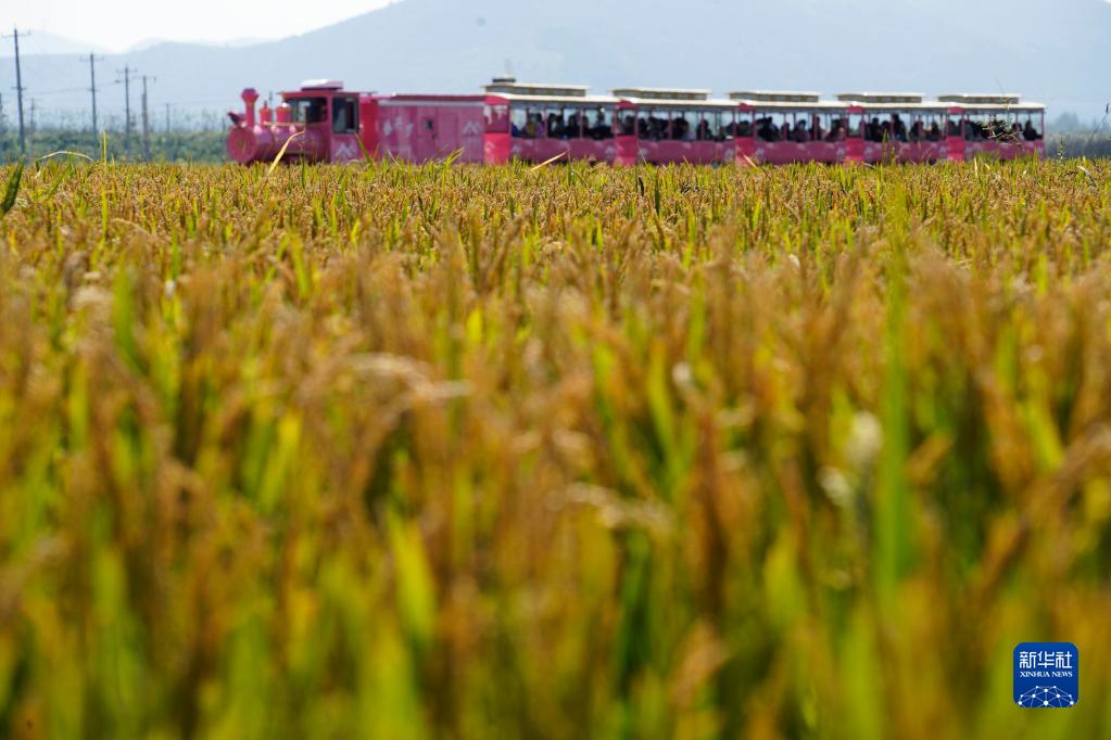 10月7日,游客在河北唐山遵化市團瓢莊鄉山里各莊村乘坐觀光小火車欣賞稻田秋景。新華社發(劉滿倉 攝)