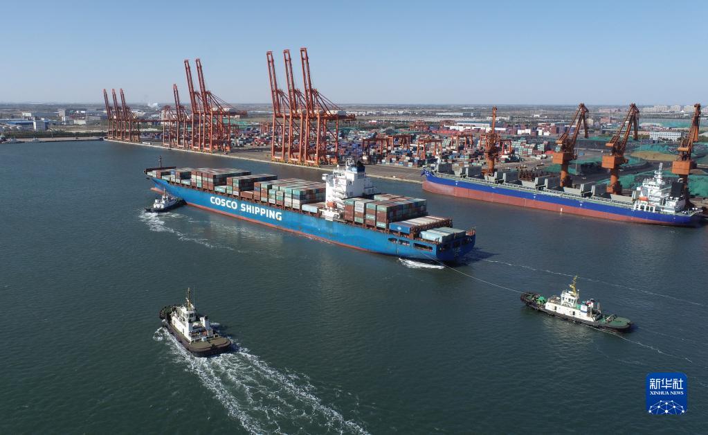 10月23日,一艘輪船向唐山港京唐港區集裝箱碼頭靠泊(無人機照片)。新華社記者 朱旭東 攝