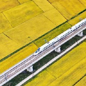9月19日,高鐵列車從吉林省公主嶺市沃野間駛過(無人機照片)。新華社記者 張楠 攝