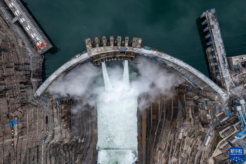 俯瞰白鶴灘水電站(無人機照片,6月28日攝)。金沙江白鶴灘水電站首批機組于6月28日安全準點投產發電。新華社記者 江文耀 攝