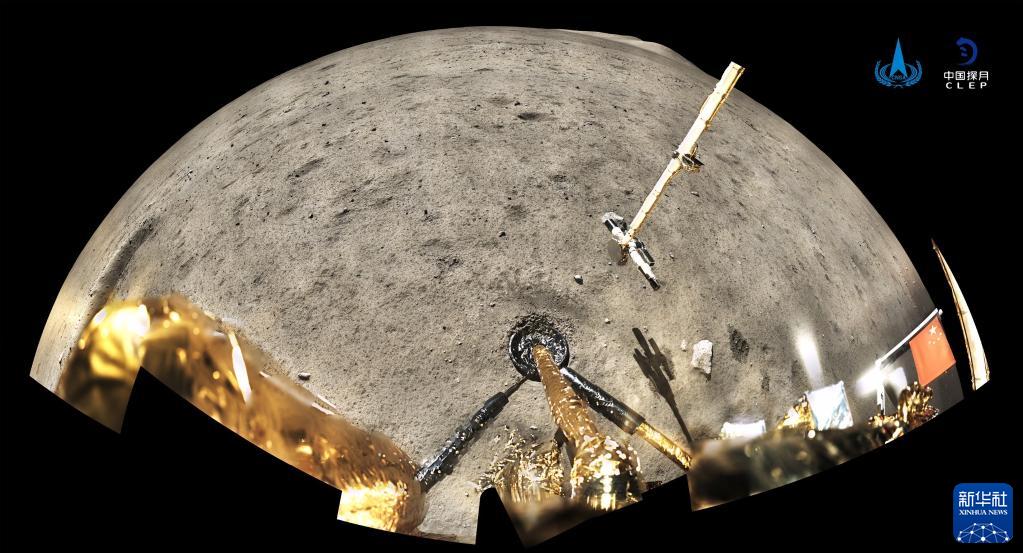 2020年12月4日,國家航天局公布了探月工程嫦娥五號探測器在月球表面國旗展示的照片。嫦娥五號著陸器和上升器組合體全景相機環拍成像,五星紅旗在月面成功展開,此外圖像上方可見已完成表取采樣的機械臂及采樣器。新華社發(國家航天局供圖)