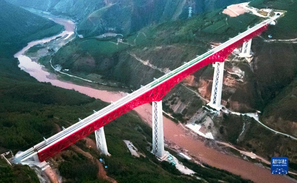 中老鐵路首發(fā)列車(chē)駛過(guò)中國(guó)云南省元江哈尼族彝族傣族自治縣境內(nèi)的元江雙線特大橋(12月3日攝,無(wú)人機(jī)照片)。新華社記者 王冠森 攝