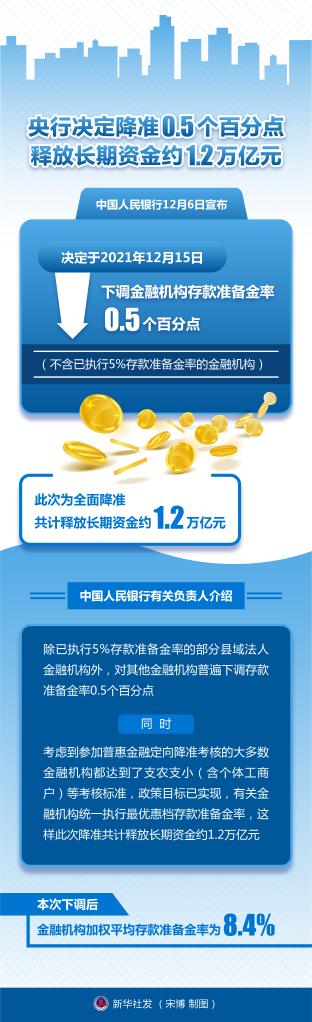 中國人民銀行12月6日宣布,決定于2021年12月15日下調(diào)金融機(jī)構(gòu)存款準(zhǔn)備金率0.5個(gè)百分點(diǎn)(不含已執(zhí)行5%存款準(zhǔn)備金率的金融機(jī)構(gòu))。此次為全面降準(zhǔn),共計(jì)釋放長期資金約1.2萬億元。新華社發(fā) 宋博 制圖