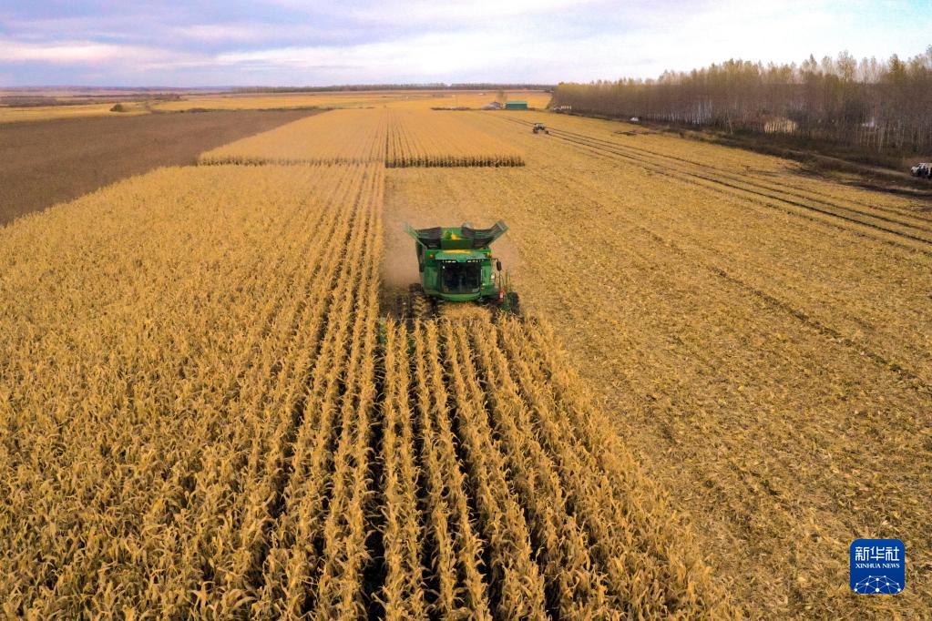 這是10月7日拍攝的黑龍江省綏化市北林區(qū)玉米收割現(xiàn)場(無人機照片)。新華社發(fā)(楊明輝 攝)