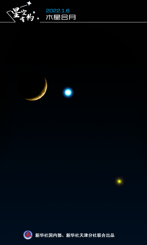 新華社天津1月4日電(記者周潤?。┬履晔讏觥靶窃峦挕本鸵涎堇玻√煳目破諏<医榻B,木星合月將于1月6日現身天宇,屆時如果天氣晴好,日落時分,感興趣的公眾面向西南方天空,憑借肉眼就可以清晰地看到木星和新月近距離“相依相伴”,競放光芒的精彩畫面。