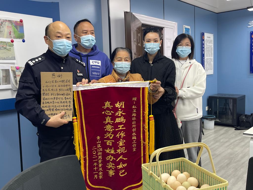 2021年12月6日,群眾前來派出所向胡永鵬贈送致謝錦旗。(武漢市公安局青山區分局提供)