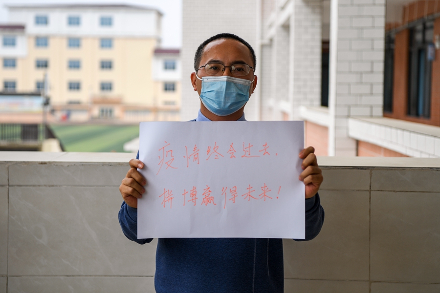 ↑東興中學物理老師何贊為高三學生加油(1月5日攝)。