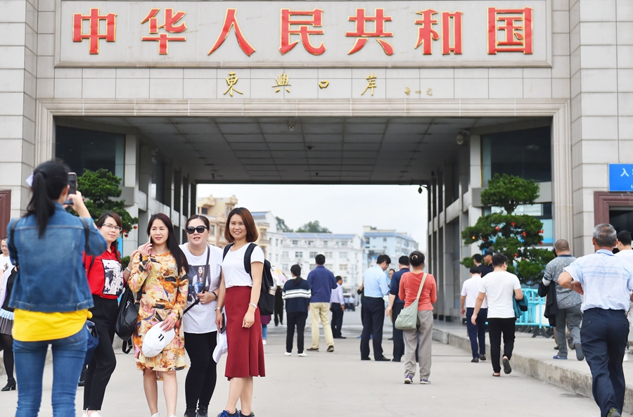 ↑這是往日繁華熱鬧的東興市,游客在東興口岸的國門前合影拍照(2019年3月21日攝)。