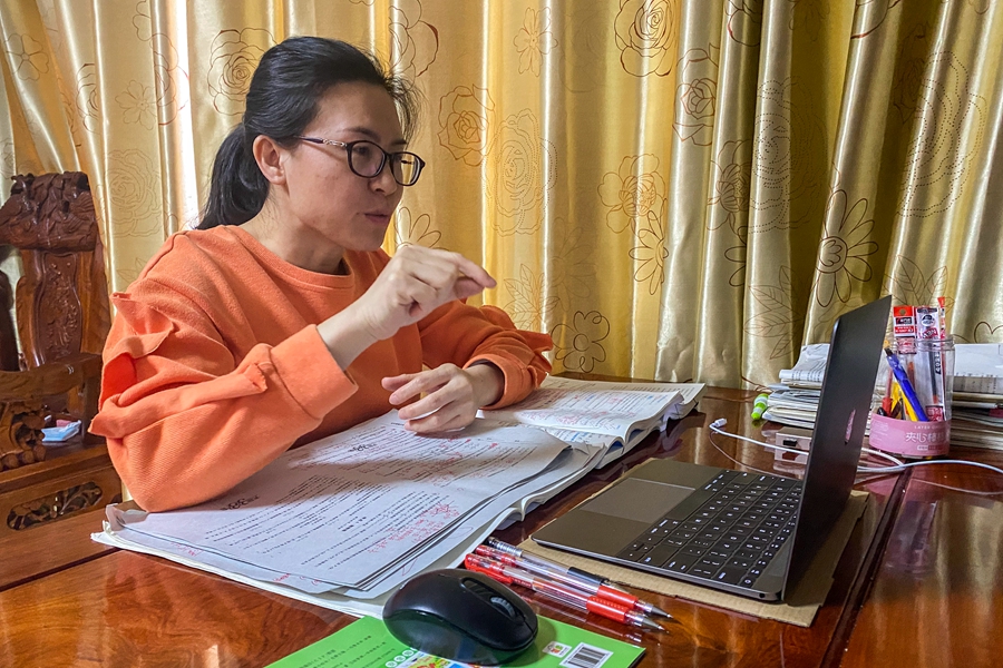 ↑1月5日晚,東興中學一名家住疫情封控區的老師在家為高三學生上網課(受訪者供圖)。