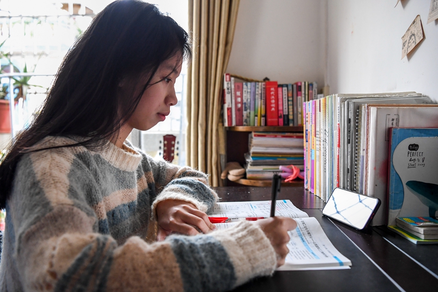 ↑1月6日,東興中學高三學生彭國梅在家上網課。
