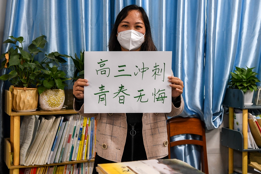 ↑東興中學英語老師李杏為高三學生加油(1月5日攝)。