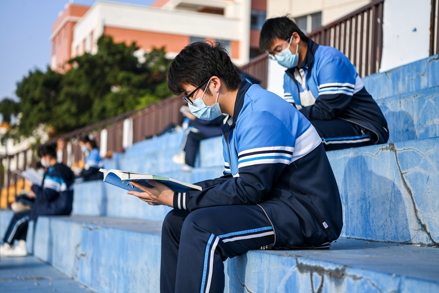 ↑1月5日,朱俊霖(前)和同學課后在室外背書。