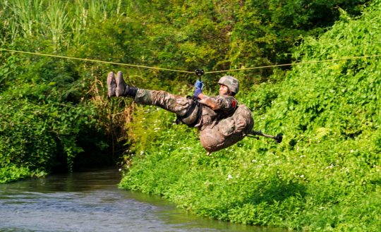 怎么辦?張飛昊需要迅速?zèng)Q斷。按照慣例是重新設(shè)置繩索,但耗時(shí)太長,容易被對(duì)手趕超。“爬過去!”他果斷下令,第一名隊(duì)員依靠過硬的身體素質(zhì),攀爬繩索過了河。